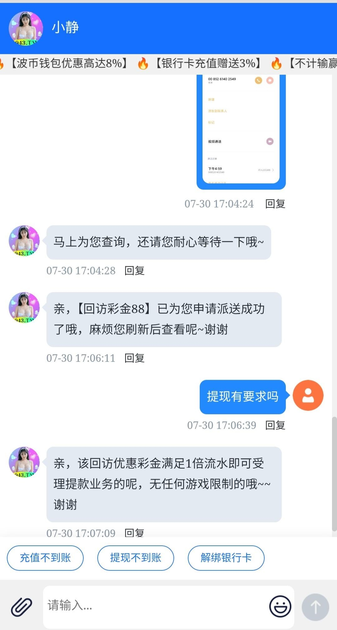 找客服领取电话回访彩金有88,可以去碰瓷一下