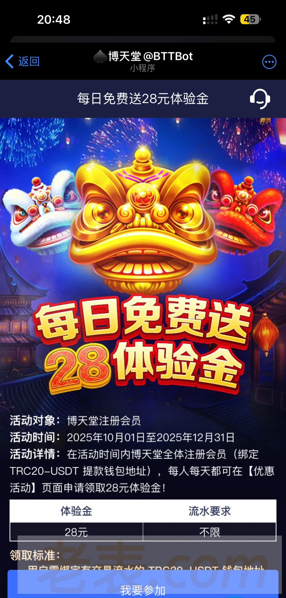 添加博天堂机器人飞机加@BTTBot 注册好之后点优惠直接点参加就可以了